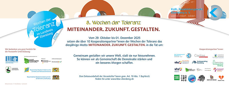 Bereits zum achten Mal finden im Landkreis Ebersberg die Wochen der Toleranz statt. Unter dem Motto „Miteinander. Zukunft. Gestalten.“ laden zahlreiche Veranstaltungen im Oktober und November dazu ein, gesellschaftliche Fragen zu diskutieren, Perspektiven zu öffnen und neue Formen des Zusammenlebens zu entwickeln.