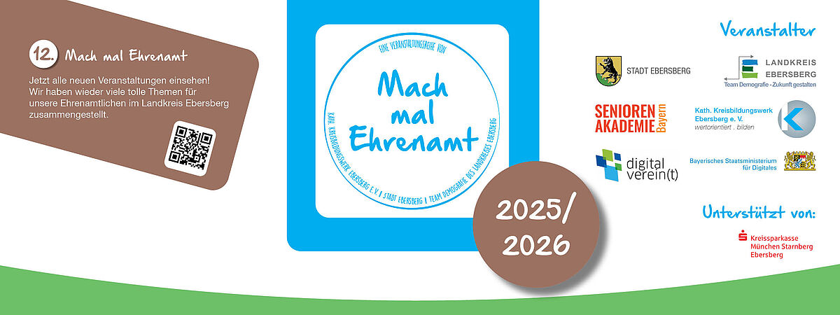 Sie lieben Ihr ehrenamtliches Engagement, möchten es aber effektiver gestalten? Dann finden Sie in unserem brandneuen Veranstaltungsprogramm „Mach Mal Ehrenamt“ genau das Richtige für Ihre Situation. „Mach Mal Ehrenamt“ ist eine Seminarreihe, die das kath. Kreisbildungswerk gemeinsam mit der Stadt Ebersberg und dem Team Demografie des Landratsamtes veranstaltet. Die Angebote rund um das Thema „Ehrenamt“ können durch die finanzielle Unterstützung des Landratsamtes kostengünstig angeboten werden.